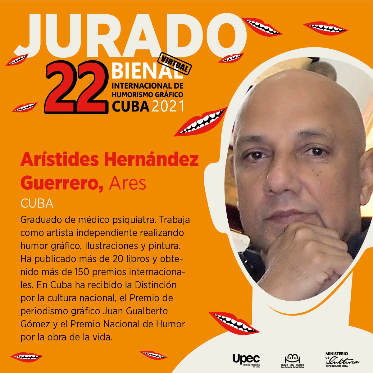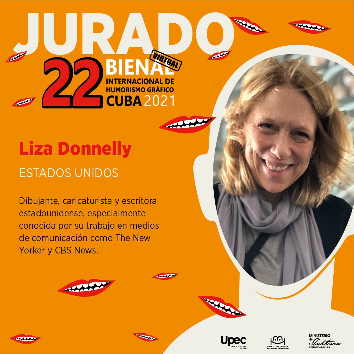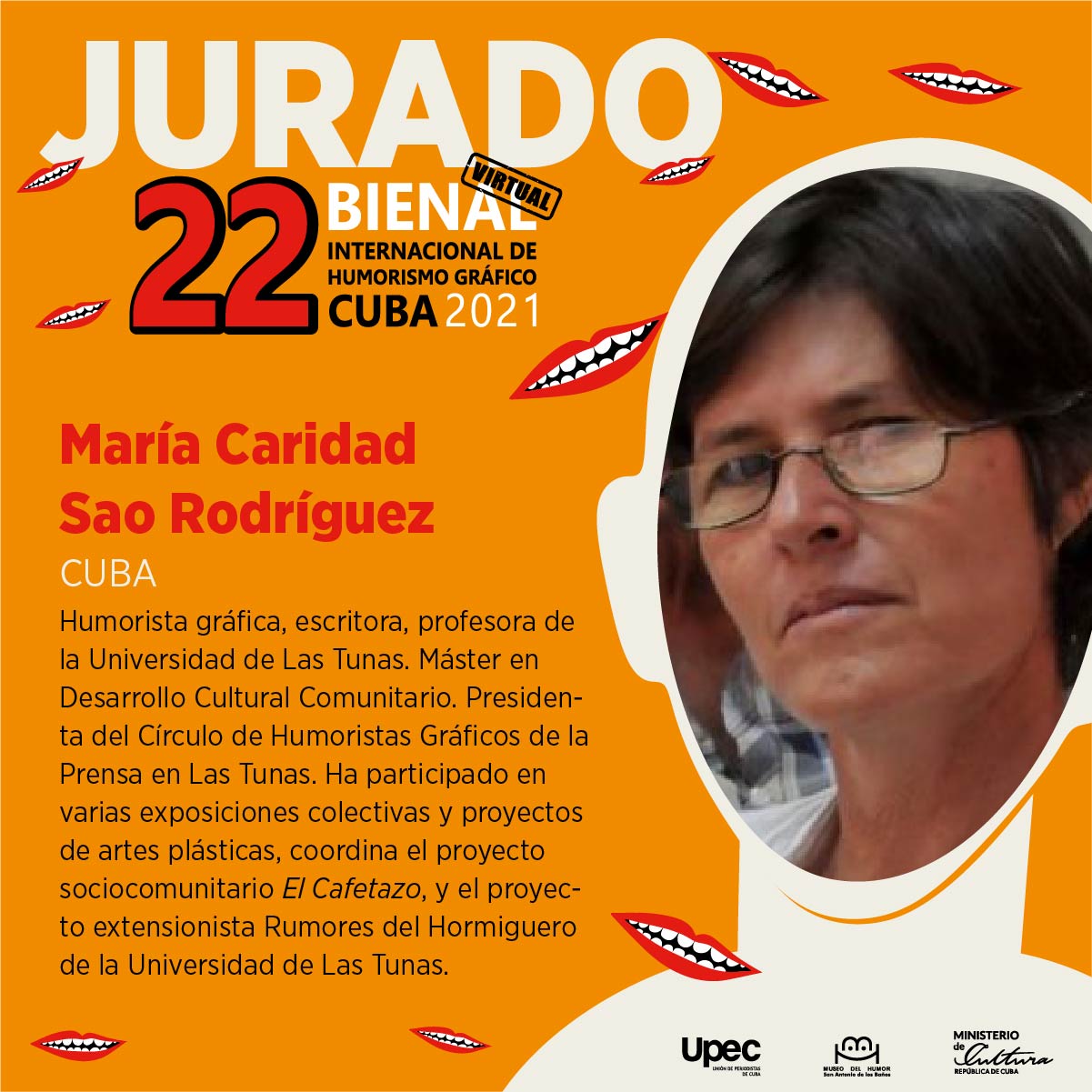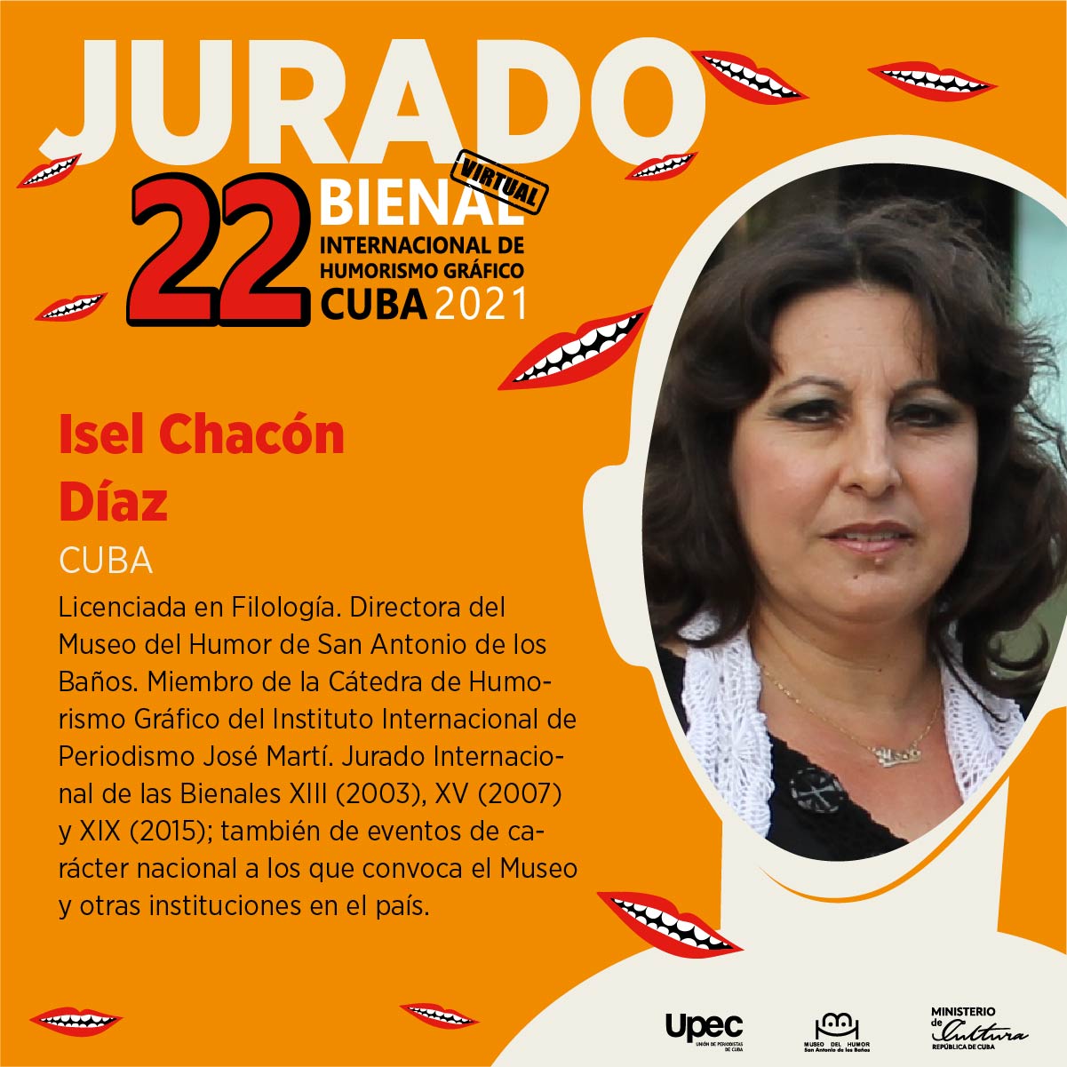 De igual forma integra el jurado la directora del Museo del Humor de San Antonio de los Baños, Isel Chacón, Licenciada en Filología, miembro de la Cátedra de Humorismo Gráfico del Instituto Internacional de Periodismo José Martí, quien se ha desempeñado como jurado de las Bienales XIII (2003), XV (2007) y XIX (2015); y también de eventos de carácter nacional a los que convocan el Museo y otras instituciones en el país.