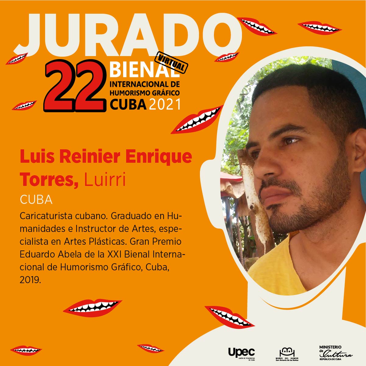 Luis Reinier Enrique Torres, Luirri, Gran Premio Eduardo Abela de la XXI Bienal en el 2019; graduado en Humanidades e Instructor de Artes y especialista en artes plásticas, cierra el elenco de jurados que tendrán la alta responsabilidad de valorar los trabajos, inspirados en el lema: “El humor nos acerca”.