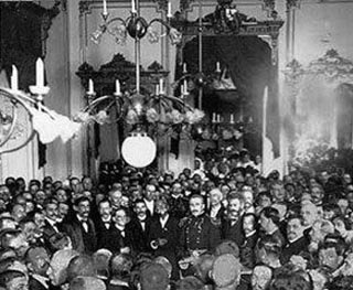 Momento de la toma de posesión del Presidente Tomas Estrada Palma rodeado por el General Máximo Gómez, el Gobernador saliente General Leonardo Wood, veteranos del Ejercito Libertador, oficiales yanquis, funcionarios del nuevo gobierno, diplomáticos e invitados. (Foto de Gómez de la Carrera)