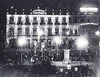 Vista nocturna de las grandes luminarias del Parque Central y el Hotel Inglaterra. La estatua de la Libertad que aparece al centro sustituyóa la de la Reina de España Isabel II.(Foto Gómez de la Carrera)