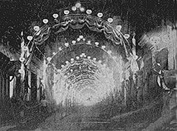 La calle Muralla adornada con arcos de bombillas eléctricas fue otra de las fotografías nocturnas publicadas en las páginas de El Fígaro. (Foto Gómez de la Carrera)
