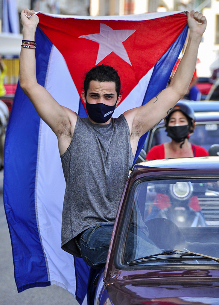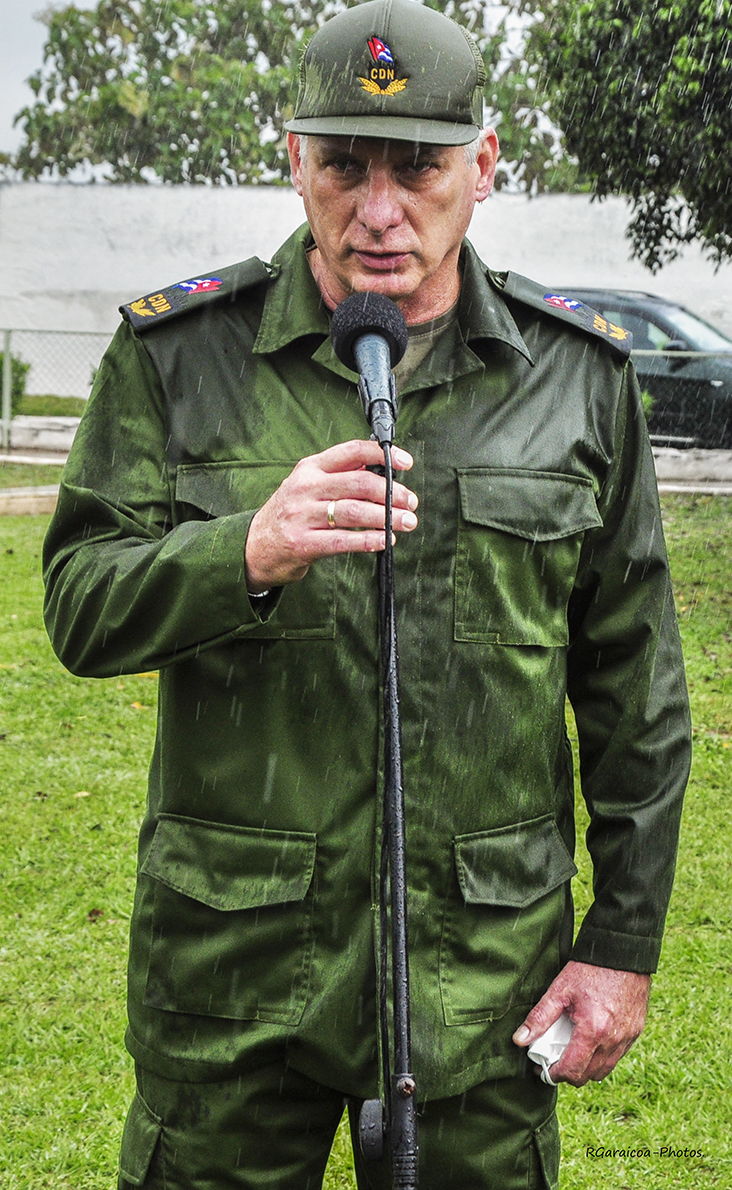 “Mientras Diaz Canel se dirigía a los presentes, micrófono en mano y vestido de verde olivo, yo tomaba fotografías. De pronto oscureció y comenzó a caer tremendo aguacero. Nada, yo me dije, el presidente con un micrófono de corriente en la mano, seguro se suspende el acto hasta que pare la lluvia. Yo cubrí mi cámara con un sobre de nylon para protegerla y quedé a la espera. Pero el presidente siguió hablando bajo el aguacero, como lo hacía Fidel, y yo dije, al carajo la lluvia y la cámara. Le quité el nylon y seguí. Con esta fotografía dejé constancia de ese momento”.