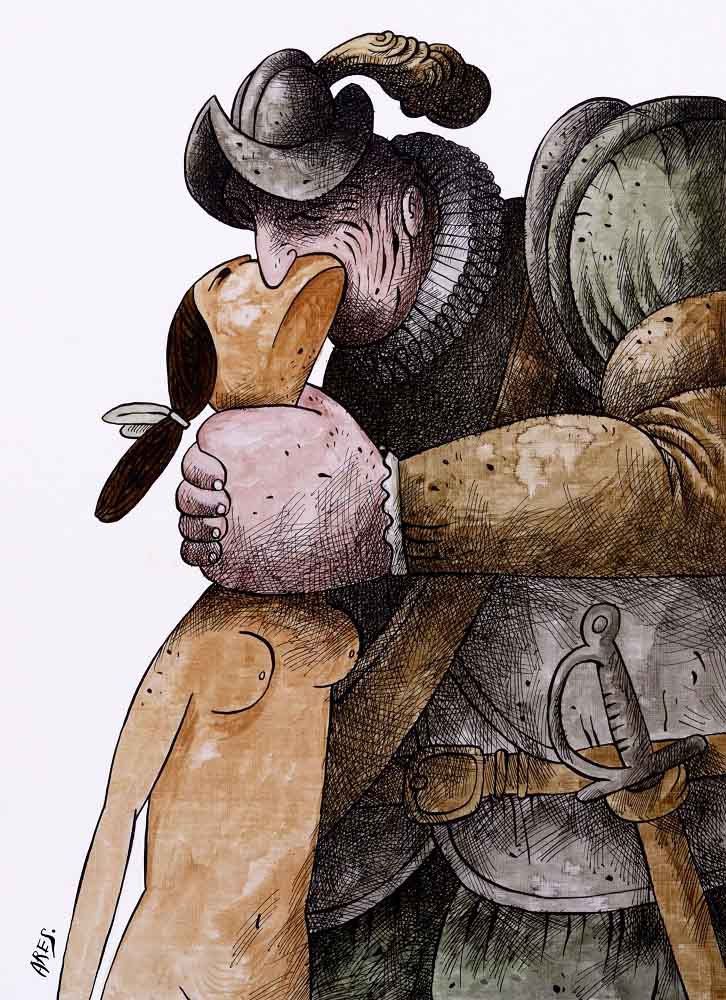 La exposición abre con una serie de dibujos a tinta y acuarela sobre cartulina, que traen al presente la Conquista y la Colonización de América por España. La factura es impecable: línea a línea, va tejiendo texturas, puliendo luces, cavando oquedades. Los personajes son vigorosos y están dotados de un color que anuncia su psicología. Ahí está la catedral barroca española, con sus volutas de piedra, oscilando para demoler la mastaba precolombina; el salvaje conquistador que, cual metáfora de la violación, ahorca y besa, a la vez, a una joven indígena; Cristóbal Colón arrodillado sobre un aborigen que en su asfixia repite a George Floyd: I can’t breathe (no puedo respirar), escoltado por los estandartes de la guerra y la religión, sintetizados en una espada que el genovés empuña como una cruz; la tristemente célebre imagen de la niña vietnamita desnuda que corre quemada por el napalm, resemantizada como una niña aborigen con plumas en la cabeza que escapa aterrada ante las naves ibéricas; la adolescente andina cargando a lomos toda una carabela; o la reina cuyo lujoso vestido, trae estampados horrendos barcos negreros…