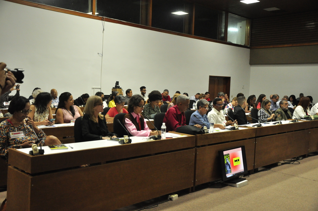 Como en una inmensa redacción de prensa, los delegados discutieron los asuntos principales del XI Congreso. Roberto Morales Ojeda, secretario de organización del Comité Central del Partido; Inés María Chapman, vice primera ministra; Rogelio Polanco Fuentes, jefe del departamento ideológico del Comité Central del Partido y Alfonso Noya Martínez, presidente del recién creado Instituto de Información y Comunicación Social, acompañaron el debate de los reporteros cubanos.