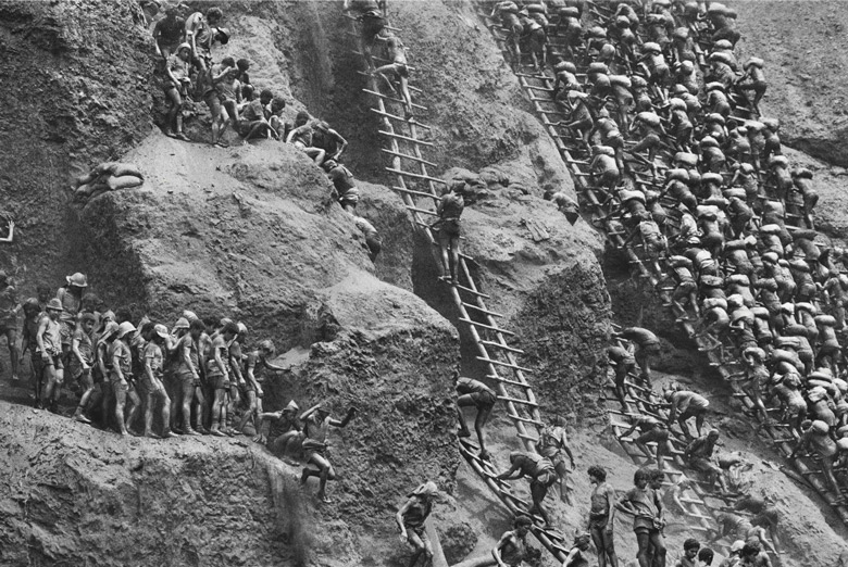 Con esta foto somos testigos de una gran puesta donde los mineros se nos revelan engarzados en una enconada lucha, dispuestos en la pátina de la imagen como pequeñas figuras insertas en las silenciosas faldas de la tierra. No solo se advierte el empeño de muchos por llegar a la cima, también se dibujan las asimetrías y los esfuerzos de actores sin rostros, enfrascados en sus rutas hacia el cenit de la mina, mientras destraban los rigores y obstáculos que impone una cartografía adversa.