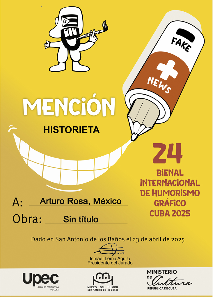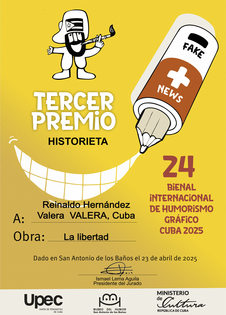 Se le otorga Primer Premio por expresar, a partir del propio lema del evento, con agudo sentido del humor los efectos de las noticias falsas en la vida cotidiana.
