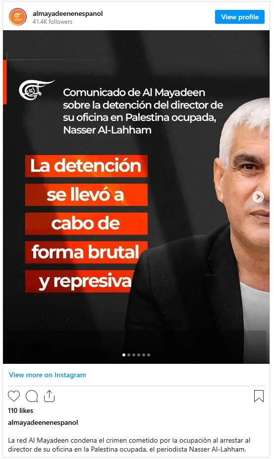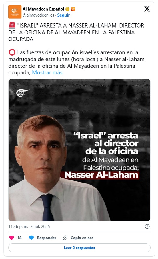 El canal panárabe Al Mayadeen denunció el arresto violento de su director en Palestina ocupada, Nasser Al-Lahham, por parte de agentes del Shin Bet israelí.