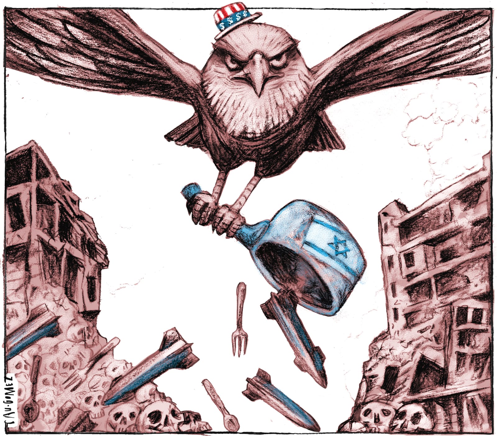Los participantes invitan a sus colegas de todo el mundo a sumarse a esta denuncia gráfica utilizando las etiquetas #gazahungry #hambregaza #freepalestine #palestinalibre #gazagenocide #genocidioengaza #undiaporgaza #adayforgaza #cartoonsforgaza