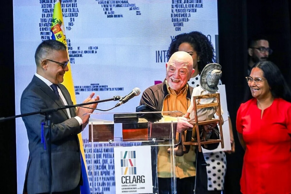 Battista recibe el premio Rómulo Gallegos de manos del ministro de Cultura de Venezuela, Ernesto Villegas. Foto: Tomada de Internet.