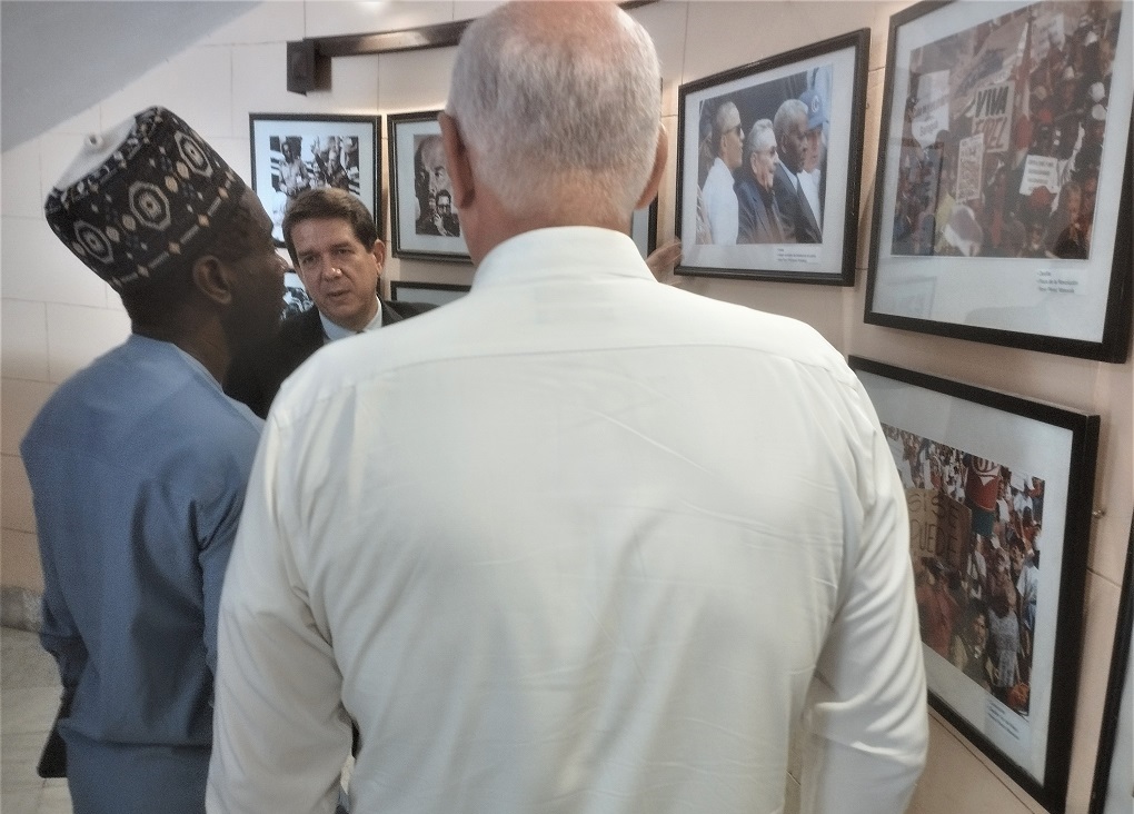 Tras apreciar con mucho interés, desde el recibidor, varias fotografías de prensa que muestran a figuras y eventos trascendentales para la Historia del mundo y el país —Fidel con Mandela o con Chávez, Raúl con Obama en La Habana, las marchas y luchas de los cubanos…— el visitante pasó al salón de protocolo, donde elogió al instante la capacidad de los periodistas de recopilar la memoria de las naciones.
