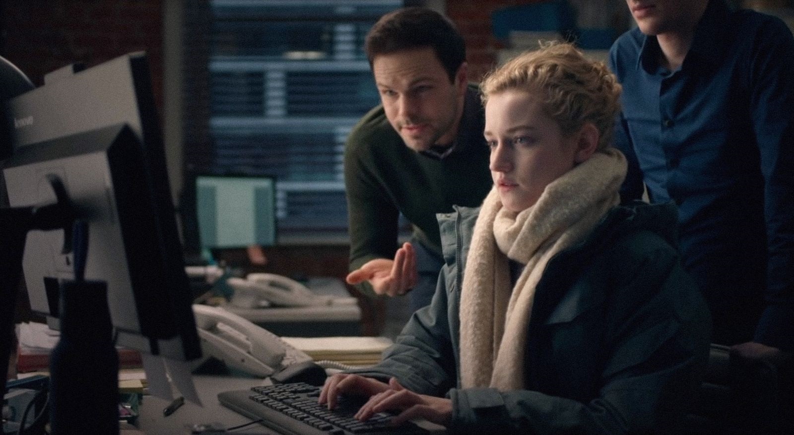 Un poderoso travelling discrimina la gama de labores de Jane. Nos deja ver que sus responsabilidades se materializan más allá de los límites espaciales de su oficina. Todo un despliegue de documentos dispuestos en mesas de escritorios encajonados, comentarios a manera de precisiones con algunos de los empleados o apuntes en forma de diálogos escenificados son desabotonados por Julia Garner. Estos recursos ejemplifican los puntos de giro de su naturaleza actoral. Con estas respuestas destraba toda visión de estar en un encierro, en un círculo estructural de la nada.