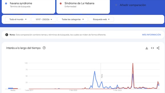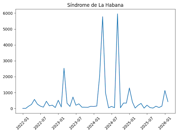 Para observar cómo este ecosistema se despliega en el espacio público digital, combinamos dos herramientas complementarias: Google Trends, que permite reconstruir el interés histórico y geográfico por términos como “Havana syndrome”, “estado fallido” o “estado patrocinador del terrorismo”; y EmbedSocial, utilizada para rastrear la circulación concreta de estas etiquetas en la conversación asociada a #Cuba en X, desde enero de 2022 hasta febrero de 2026, identificando picos de atención, momentos de amplificación y patrones de propagación.