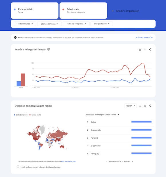 El gráfico de Google Trends sobre “Estado fallido / failed state” aporta un dato revelador: Cuba aparece como una de las regiones con mayor interés por esa búsqueda en el período observado.