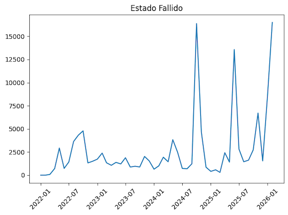 En X, “Estado fallido” presenta un comportamiento episódico pero cada vez más intenso, con explosiones notables a mediados de 2024, en 2025 y un máximo histórico en enero de 2026.