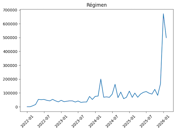 En X se observa un patrón claro: baja frecuencia cotidiana, pero picos extremadamente altos. Hay crecimiento gradual durante 2023, escalada fuerte en 2024 y un pico máximo a inicios de 2025, seguido de caída brusca y repuntes posteriores. Es el comportamiento típico de una etiqueta administrativa: no vive en el flujo diario; entra como “shock informativo” asociado a anuncios, decisiones de alto nivel y movimientos regulatorios. Funciona como arma de impacto concentrado.