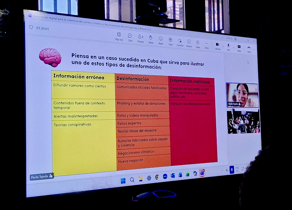 “Organizamos este taller en alianza con el Instituto de Información y Comunicación Social para fortalecer las capacidades de identificar, verificar y contrarrestar la información falsa durante desastres, utilizando metodologías y herramientas digitales”, afirmó Elena Nápoles Rodríguez, oficial a cargo del Programa de Comunicación e Información de la Oficina Regional de la Unesco en Cuba.